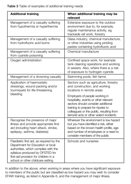 - First Aider at Work (FAW): Trained to provide a higher level of first aid and the ability to treat more serious injuries and illnesses. This should be a three- day course (18 hours) and include a practical assessment.